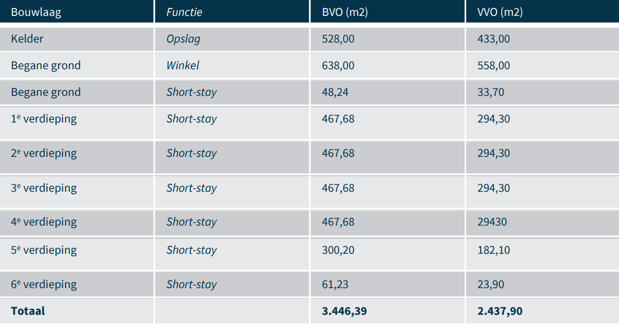Het object beschikt over 8 bouwlagen, bestaande uit een souterrain welke dienst doet als opslag en bergingen; een retail plint verhuurt aan Omoda; en 6 verdiepingen, voorzien van eigen entree en verhuurt als kantoor, na transformatie (ontwikkelplan) zijn deze opgedeeld in 74 stuks short-stay wooneenheden.